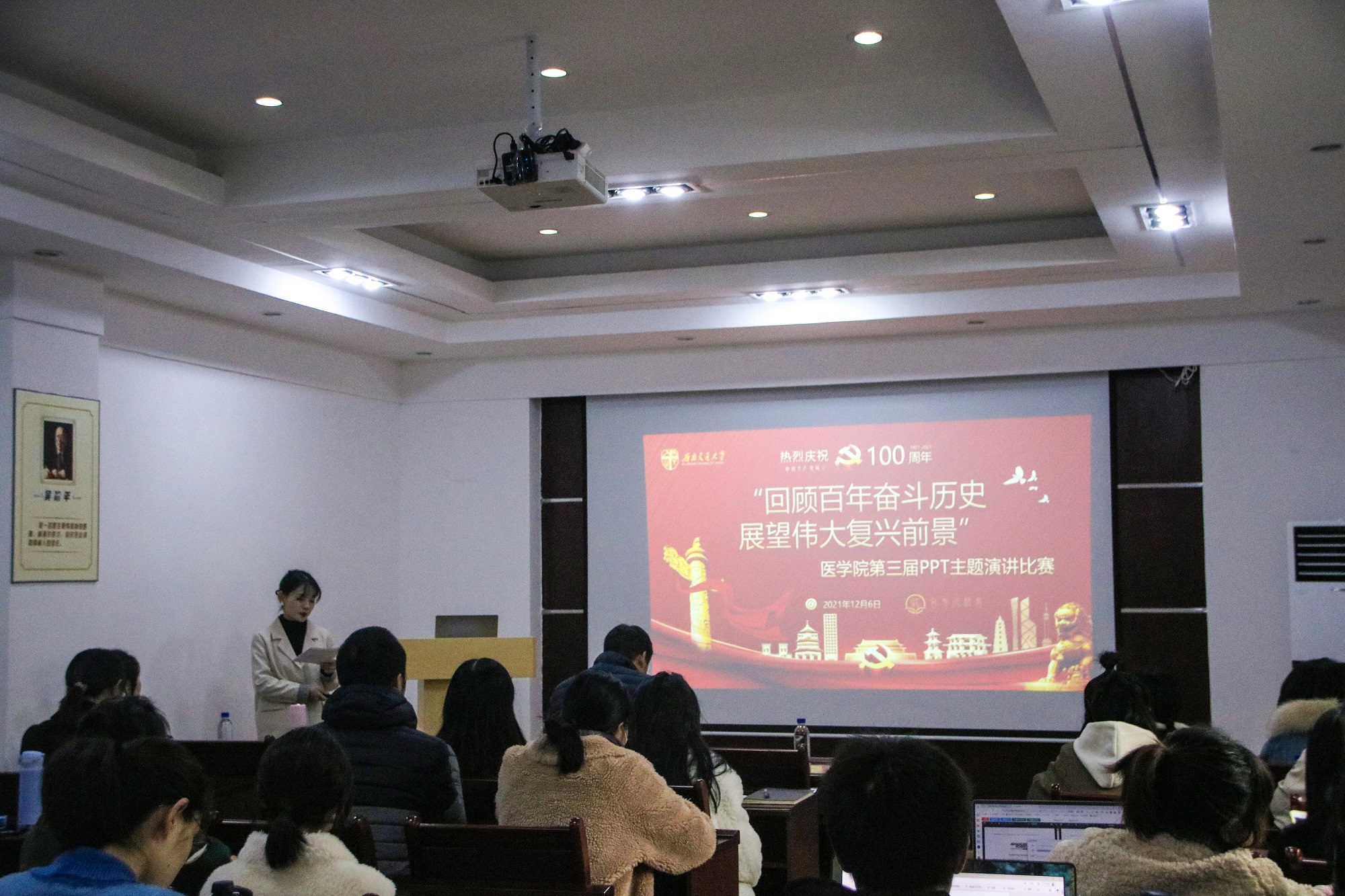 为进一步激发万象城娱乐allwincity体育师生的爱党、爱国热情,激励同学们传承先辈精神,坚定理想信念,同时提高广大学生PPT制作与演讲能力,2021年12月6日下午3点,由万象城娱乐allwincity体育举办的“回顾百年奋斗历史,展望伟大复兴前景”第三届PPT演讲比赛顺利举行,万象城娱乐allwincity体育党委李锦红书记,辅导员胡豪老师、黄雪梅老师,组织员蔡俊俊老师,以及高年级班委、研会主席团成员出席并担任评委。